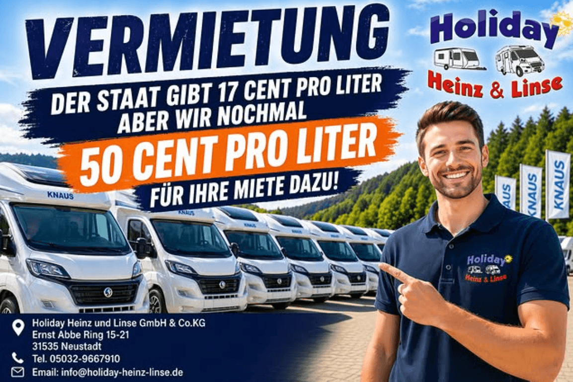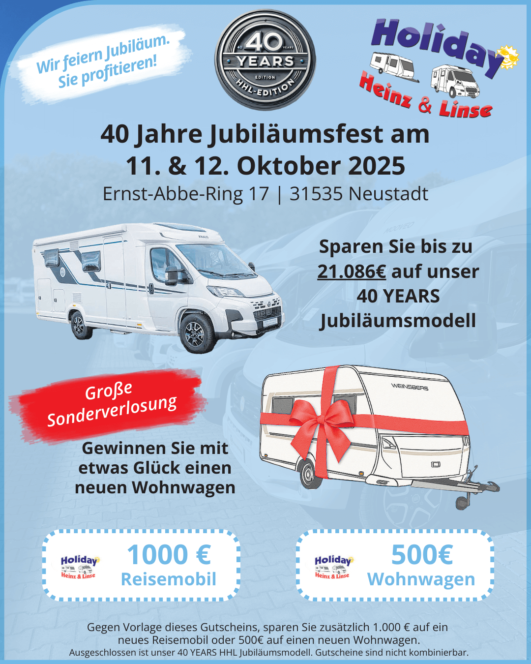 Hier ist für jeden Campingliebhaber etwas dabei: Denn wer bei Holiday Heinz & Linse ankommt, kann vom Alltag abschalten. Auf mehr als 18.000 m² zeigen wir Ihnen die neusten Caravans und Reisemobile der Firmen Knaus, Weinsberg, Kabe, Tabbert und Hymer, sowie verschiedene Gebrauchtfahrzeuge & Vorführmodelle in großer Auswahl. Lassen Sie Ihren Traumurlaub auf Rädern also endlich Wirklichkeit werden!